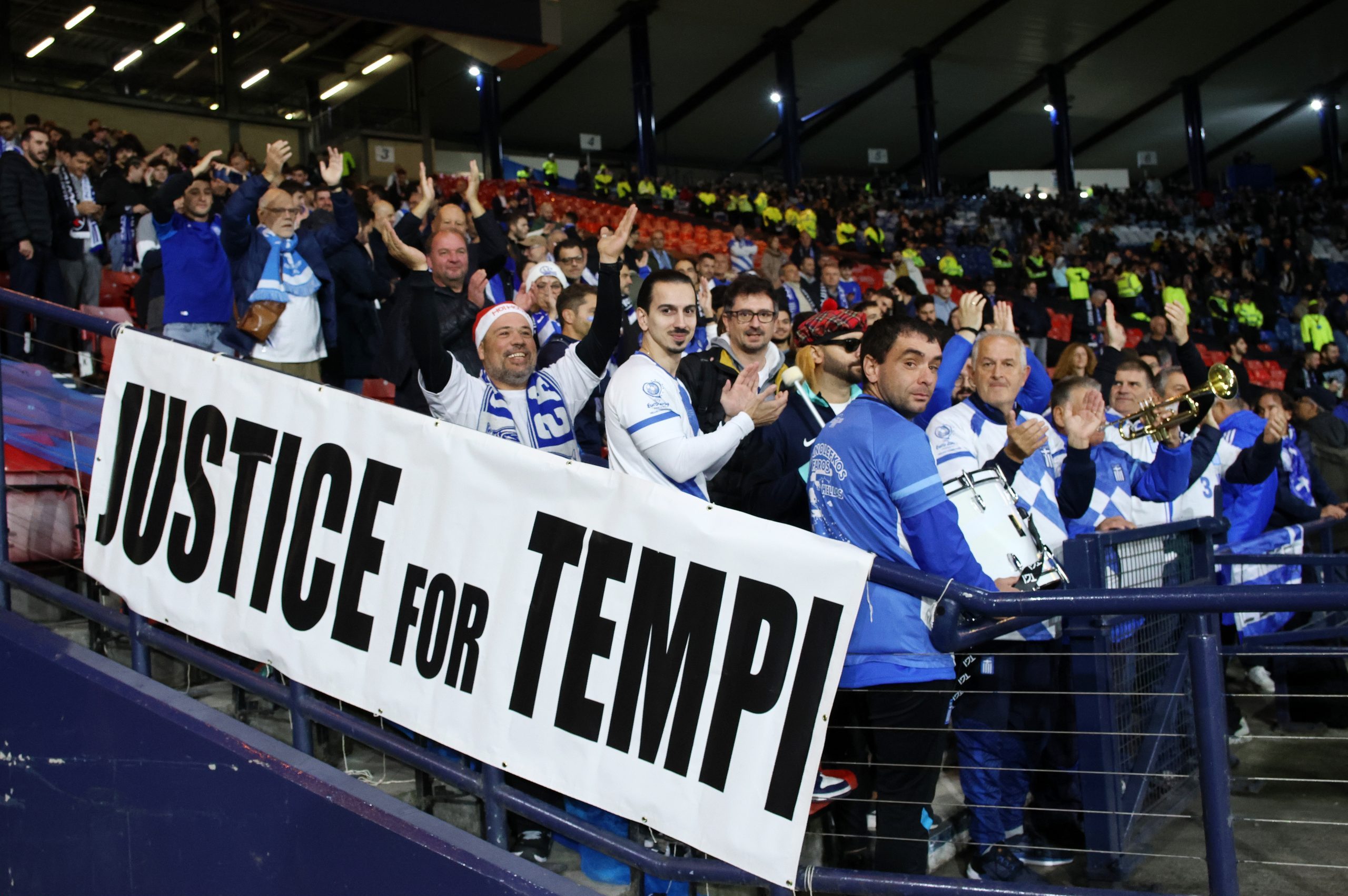 Μάλιστα στην κατοχή τους είχαν ένα πανό στο οποίο ζητούν δικαιοσύνη για τα Τέμπη, το οποίο κρέμασαν στις εξέδρες του γηπέδου.