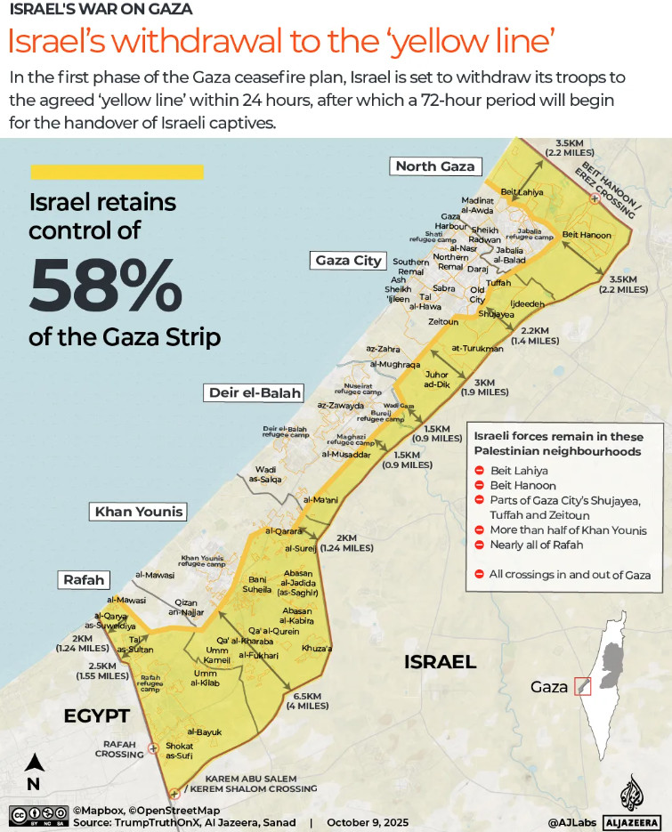 Το Ισραήλ ελέγχει σήμερα πάνω από το 80% της Λωρίδας της Γάζας (365 τ.χλμ.), συμπεριλαμβανομένων περιοχών με διαταγές εκκένωσης και στρατιωτικές ζώνες. Με την εφαρμογή της συμφωνίας, οι ισραηλινές δυνάμεις θα αποχωρήσουν εντός της κίτρινης περιοχής, αφήνοντας περίπου το 58% της Γάζας υπό ισραηλινό έλεγχο, σύμφωνα με στοιχεία της Al Jazeera.