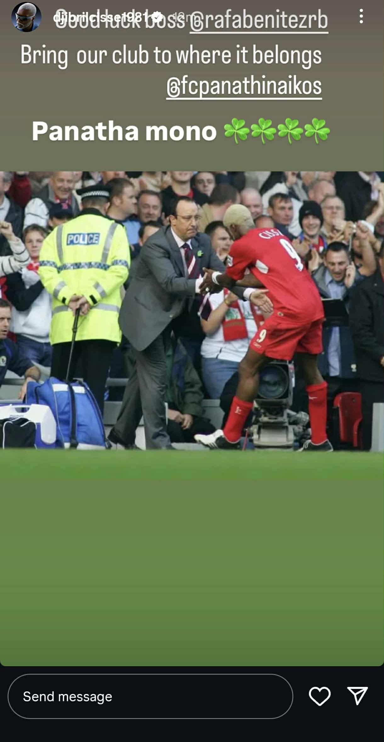 Αλλαγή σκυτάλης στον πάγκο του Παναθηναϊκού, με τον Ράφα Μπενίτεθ να αναλαμβάνει τα ηνία της ομάδας, με στόχο φυσικά να την οδηγήσει στον δρόμο των επιτυχιών. Στον 65χρονο Ισπανό τεχνικό έκανε αναφορά και ο Τζιμπρίλ Σισέ από τα Μέσα Κοινωνικής Δικτύωσης. Ο παλαίμαχος Γάλλος σταρ του «τριφυλλιού» να ευχήθηκε καλή επιτυχία στον πρώην προπονητή του με ανάρτηση στον προσωπικό του λογαριασμό.