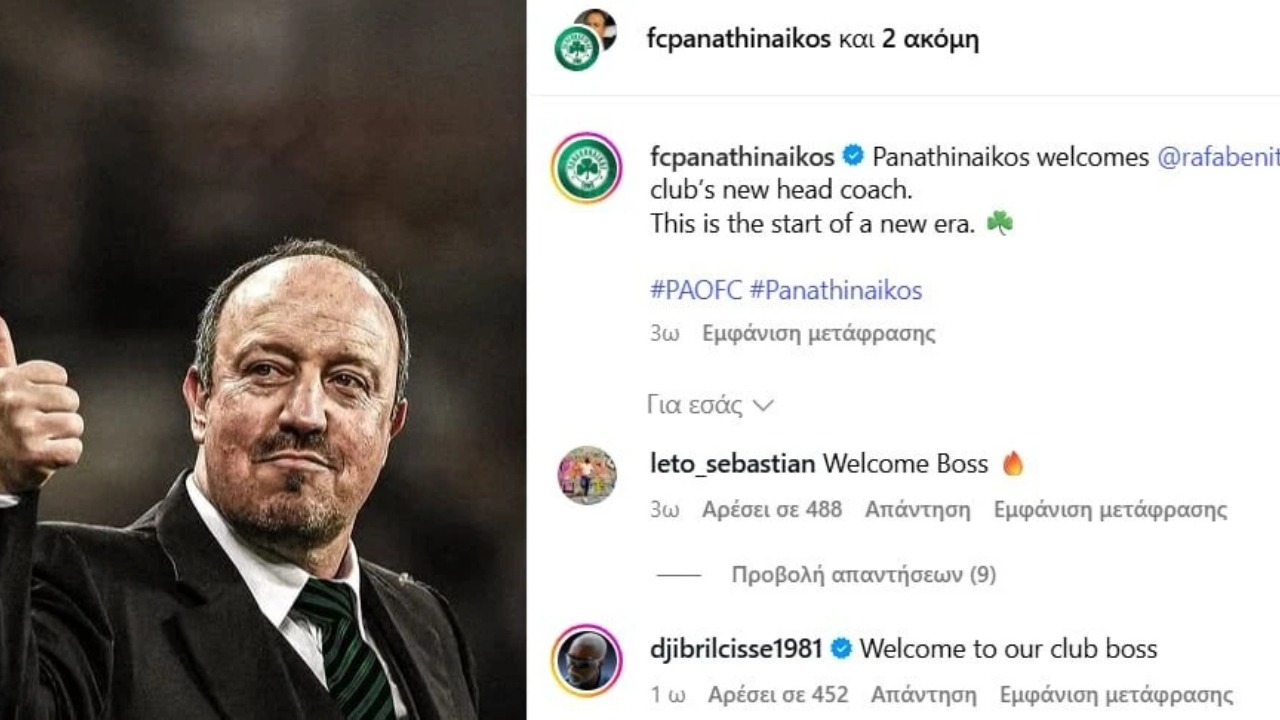 Με σχόλια στη δημοσίευση του Παναθηναϊκού στο Instagram για την επίσημη υποδοχή των «Πράσινων» στον νέο τους προπονητή, Ράφα Μπενίτεθ, καλωσόρισαν δύο «θρύλοι» του Τριφυλλιού τον Ισπανό τεχνικό.