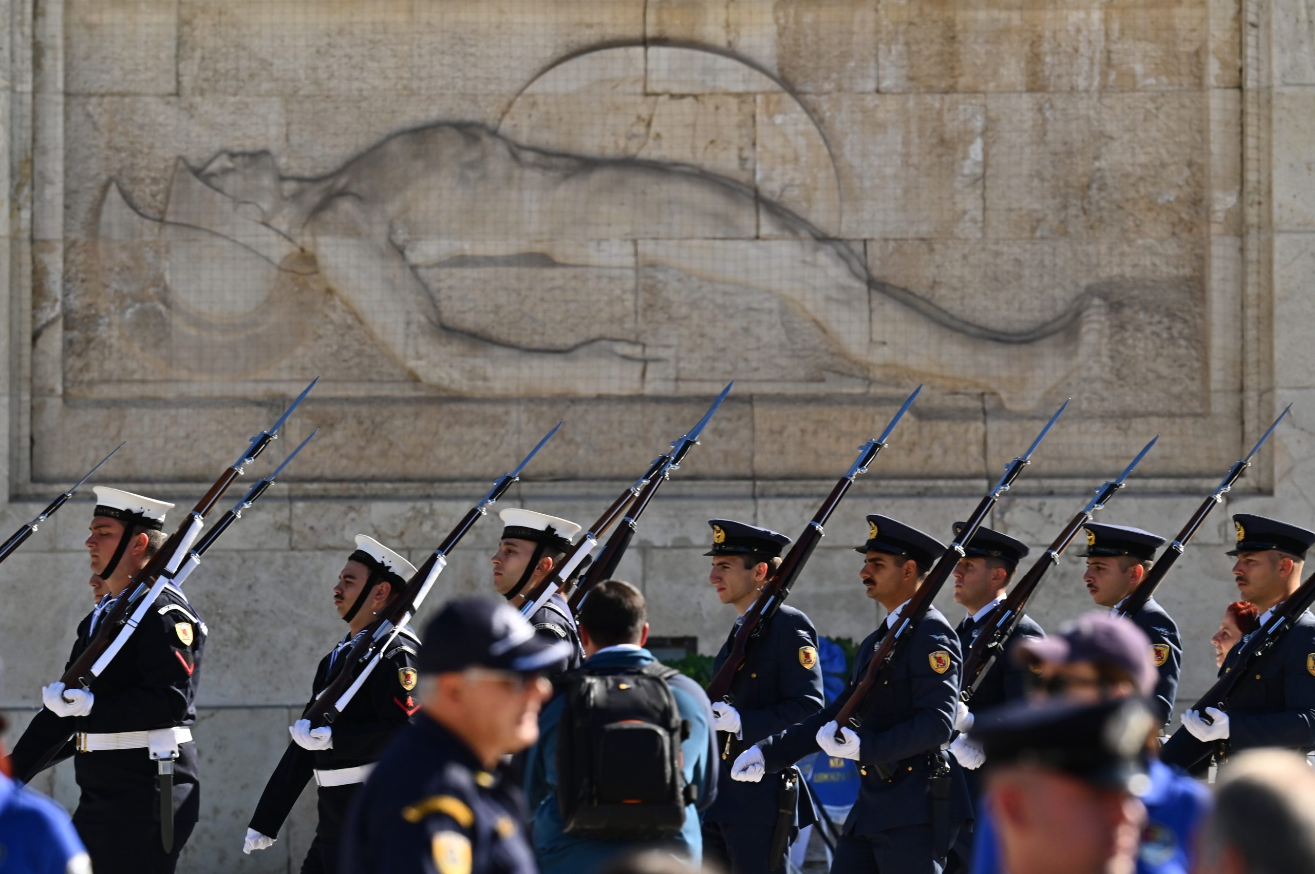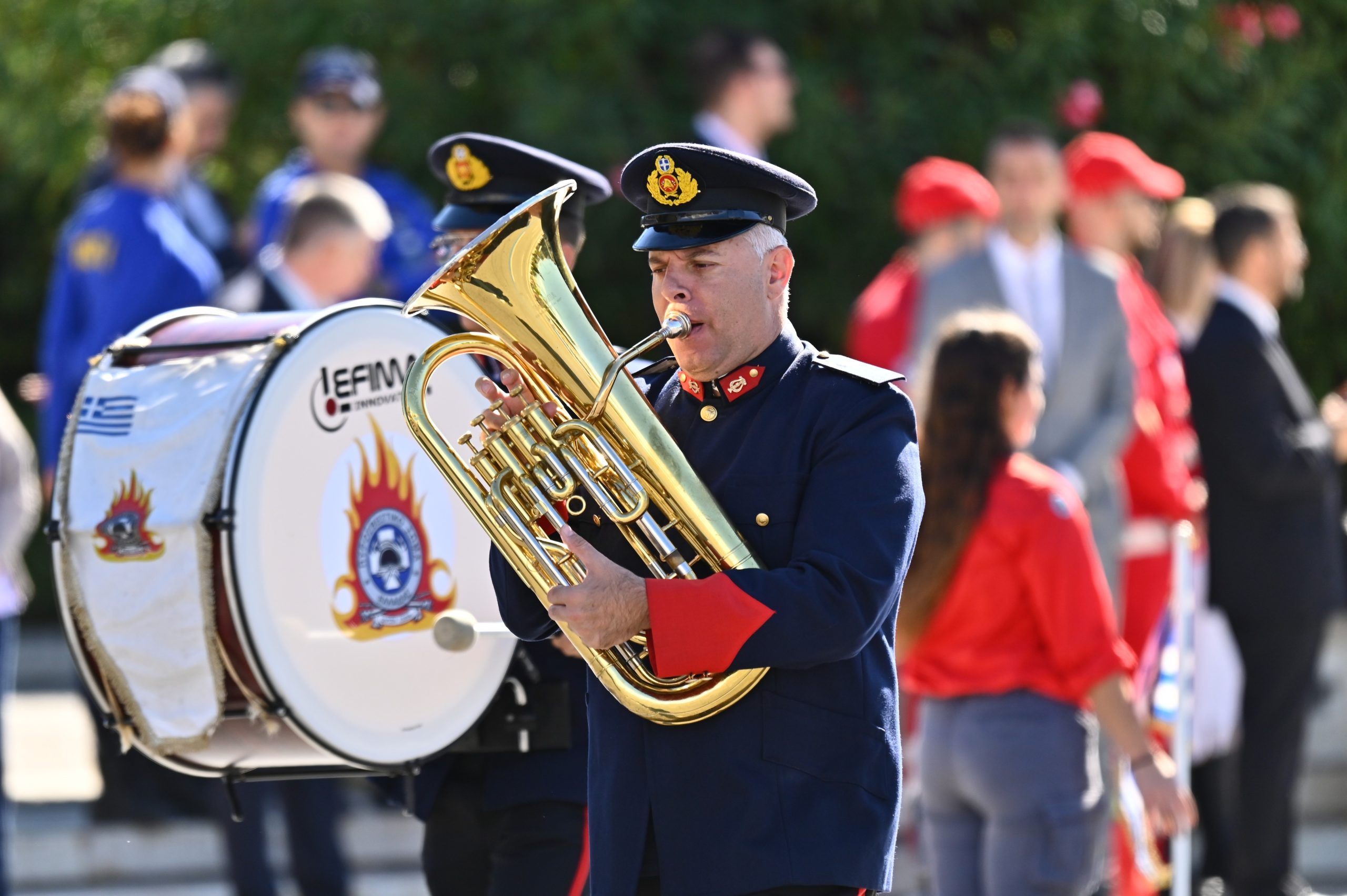 Αντιπροσωπευτικά τμήματα μαθητών και μαθητριών από όλα τα σχολεία του δήμου Αθηναίων παρέλασαν μπροστά από το Μνημείο του Άγνωστου Στρατιώτη και το ελληνικό Κοινοβούλιο, συνοδεία της φιλαρμονικής ορχήστρας του δήμου.