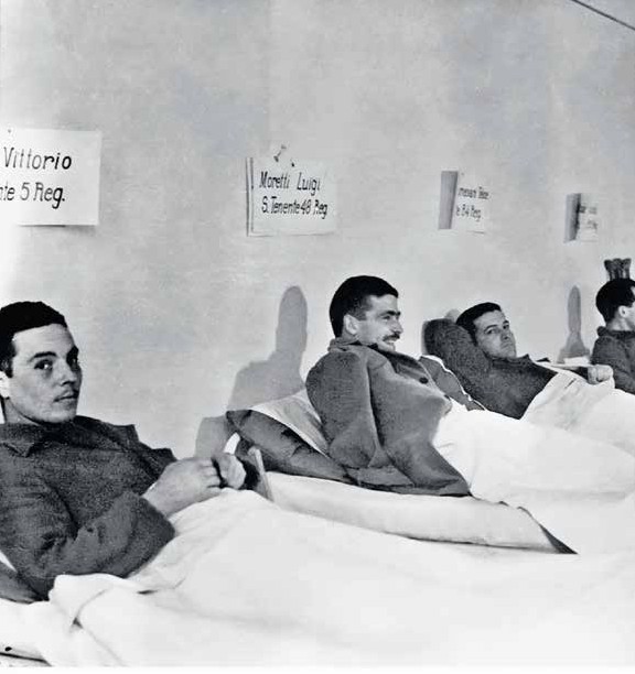 Ιταλοί αξιωματικοί, αιχμάλωτοι τραυματίες μέσα σε θάλαμο. Πάνω από τα κρεβάτια τους αναγράφονται τα ονόματα και η μονάδα στην οποία ανήκαν