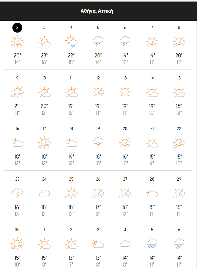 | Αθήνα | 19°C | 11°C | Ήπια πτώση μετά τις 12/11 |