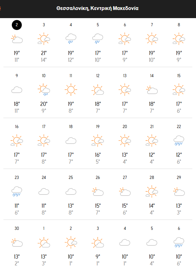 | Θεσσαλονίκη | 17°C | 9°C | Ενίσχυση ψύχρας και βόρειοι άνεμοι |