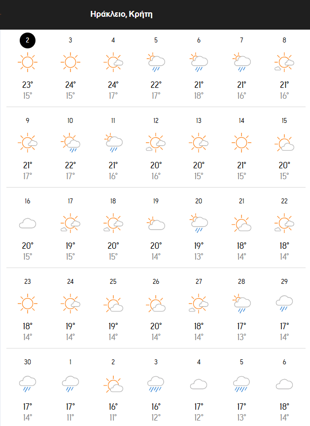 | Ηράκλειο | 21°C | 14°C | Μικρή μεταβολή, νοτιάδες κατά διαστήματα |