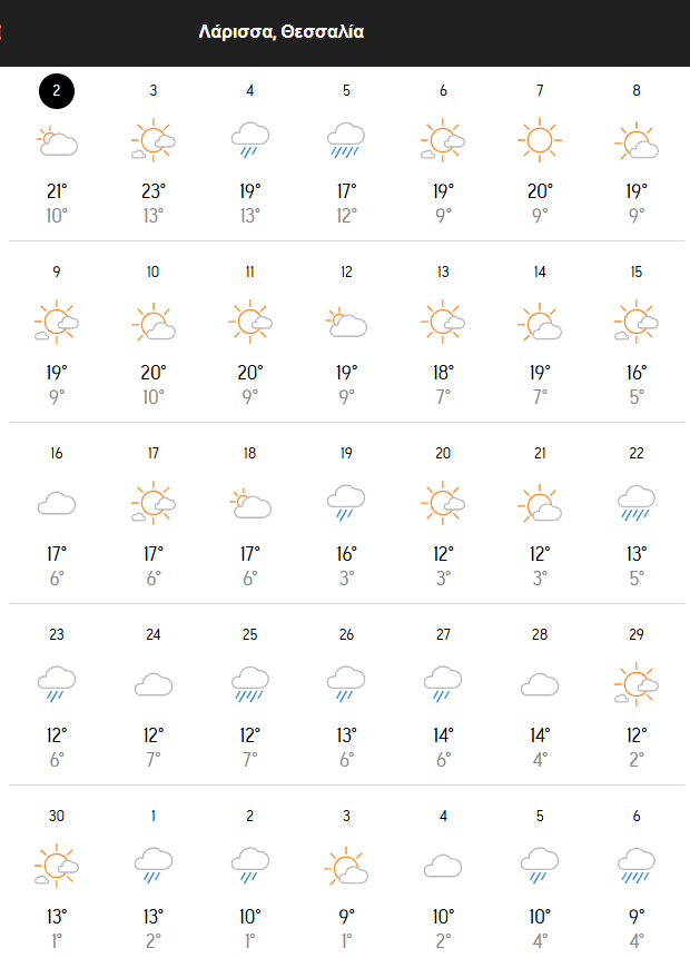 | Λάρισα | 15°C | 7°C | Κρύες νύχτες, πιθανές ομίχλες |