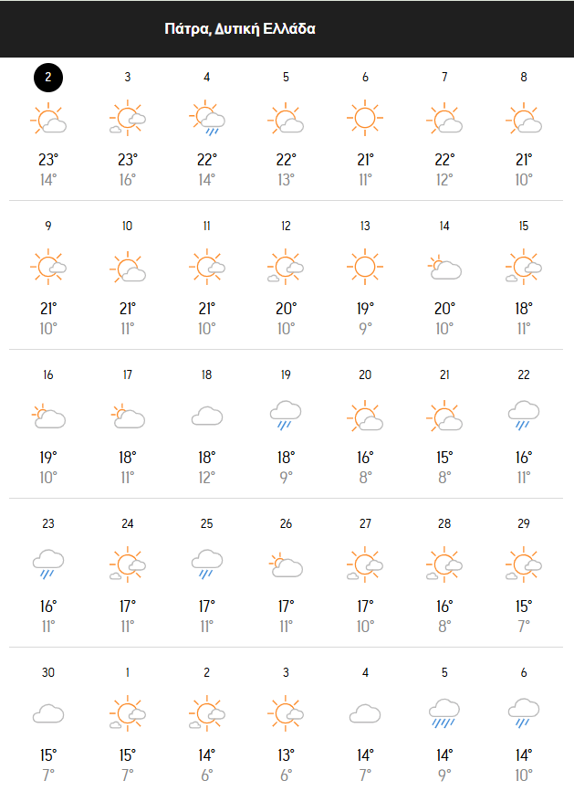 | Πάτρα | 18°C | 10°C | Περιστασιακές βροχές, ήπιο κλίμα |