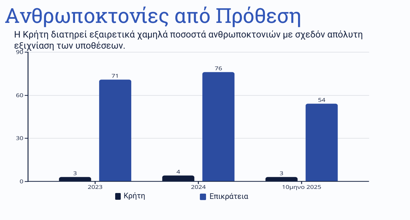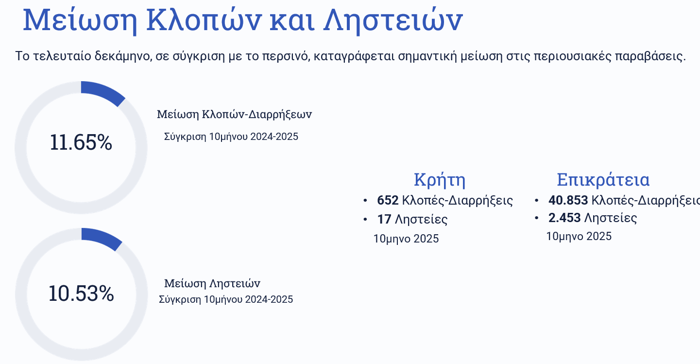 Παρουσιάζοντας τα σχετικά στοιχεία για την παραβατικότητα, ο κ. Χρυσοχοΐδης τόνισε ότι η Κρήτη εμφανίζει σταθερά πτωτική τάση, με δείκτες σημαντικά χαμηλότερους σε σχέση με τον μέσο όρο της χώρας.