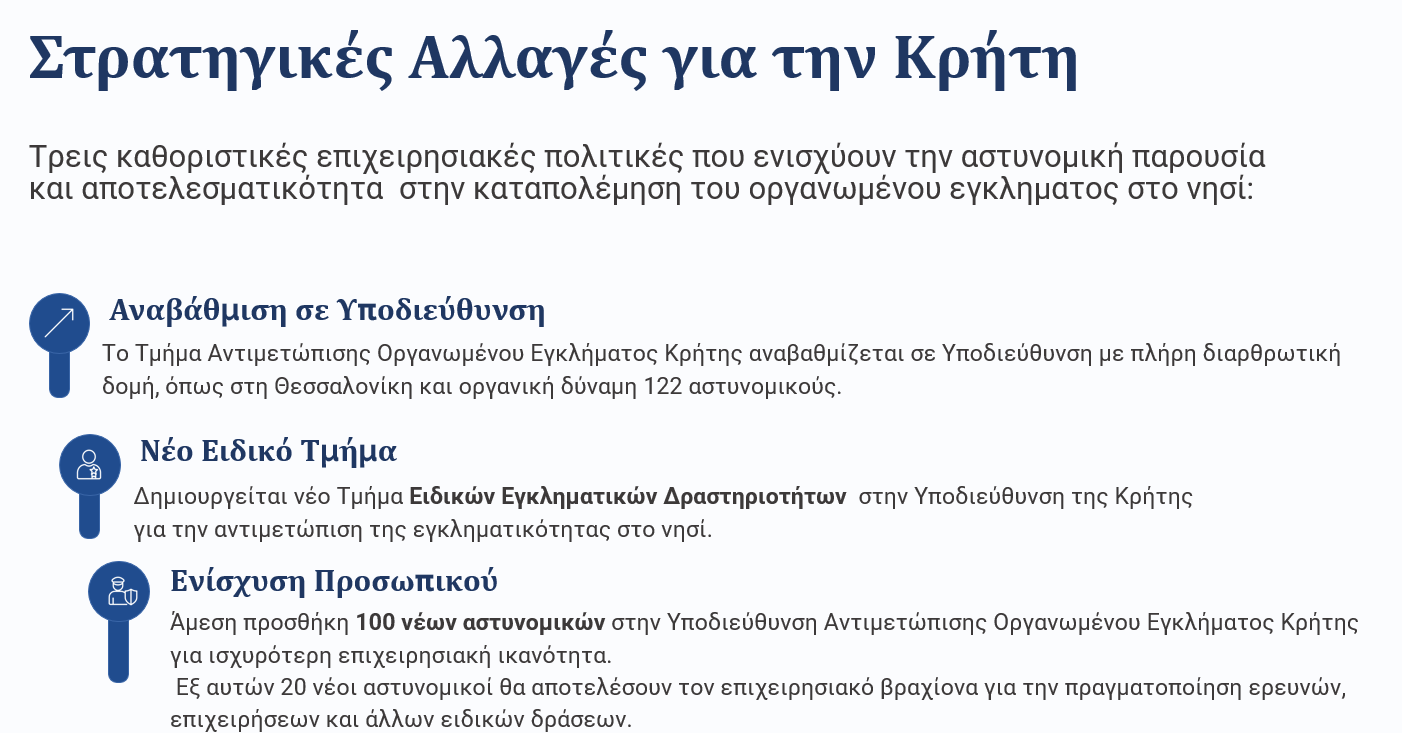 -Δημιουργείται νέο τμήμα ειδικών εγκληματικών δραστηριοτήτων στην υποδιεύθυνση Κρήτης για την αντιμετώπιση της εγκληματικότητας στην Κρήτη. Από τους 122 οι 100 θα προσληφθούν και θα είναι παρόντες από την 1η Μαρτίου στη νέα υπηρεσία.