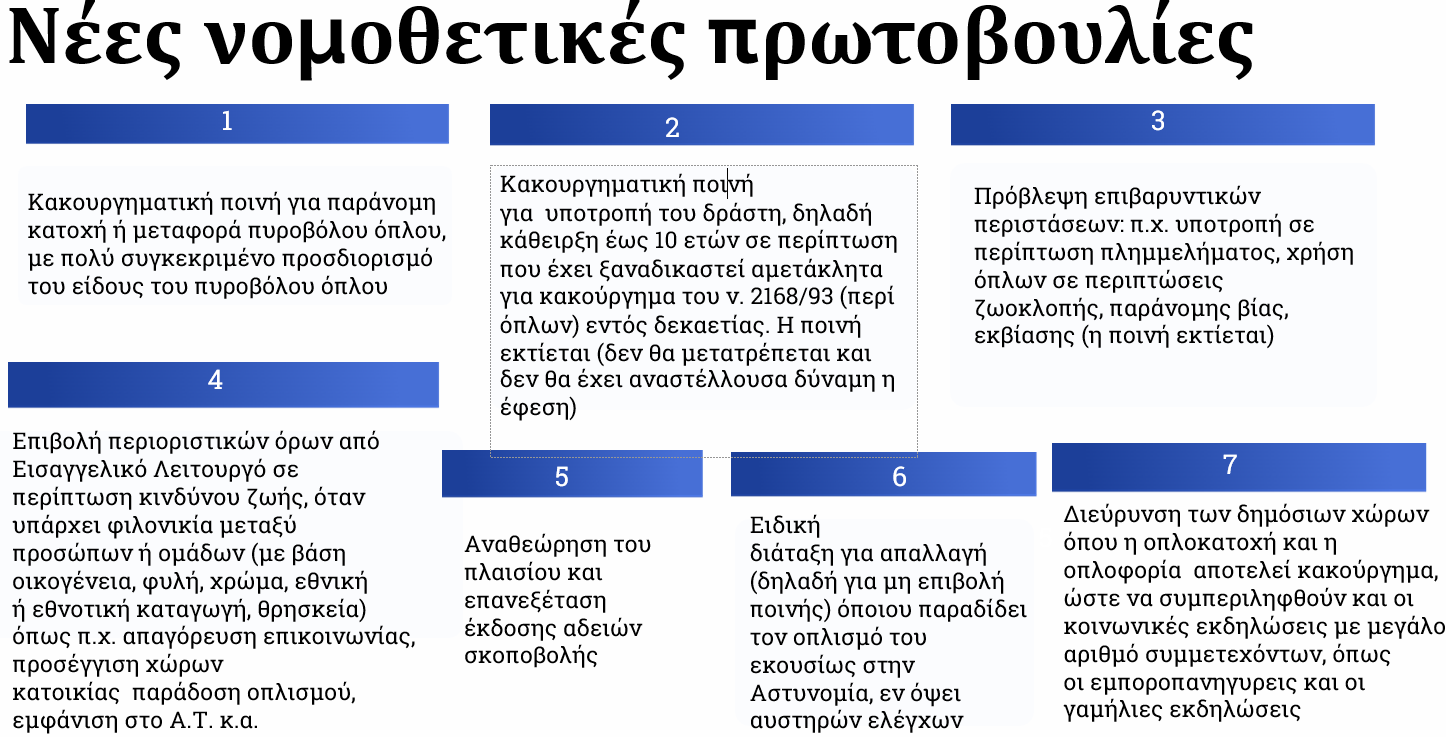 Σύμφωνα με τις ανακοινώσεις του κ. Χρυσοχοΐδη, η νέα νομοθεσία περιλαμβάνει αυστηρότερες ποινές και νέα μέτρα για την οπλοκατοχή και τη χρήση όπλων. Ειδικότερα: