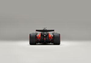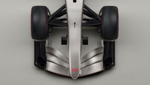 Indoor studio shot, exterior, bird’s-eye view, detail of wheel suspension, nose, and front wing
