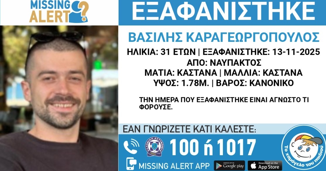 Στις 13/11/2025, πρωινές ώρες, εξαφανίστηκε από την πόλη της Ναυπάκτου ο Βασίλης Καραγεωργόπουλος, 31 ετών.