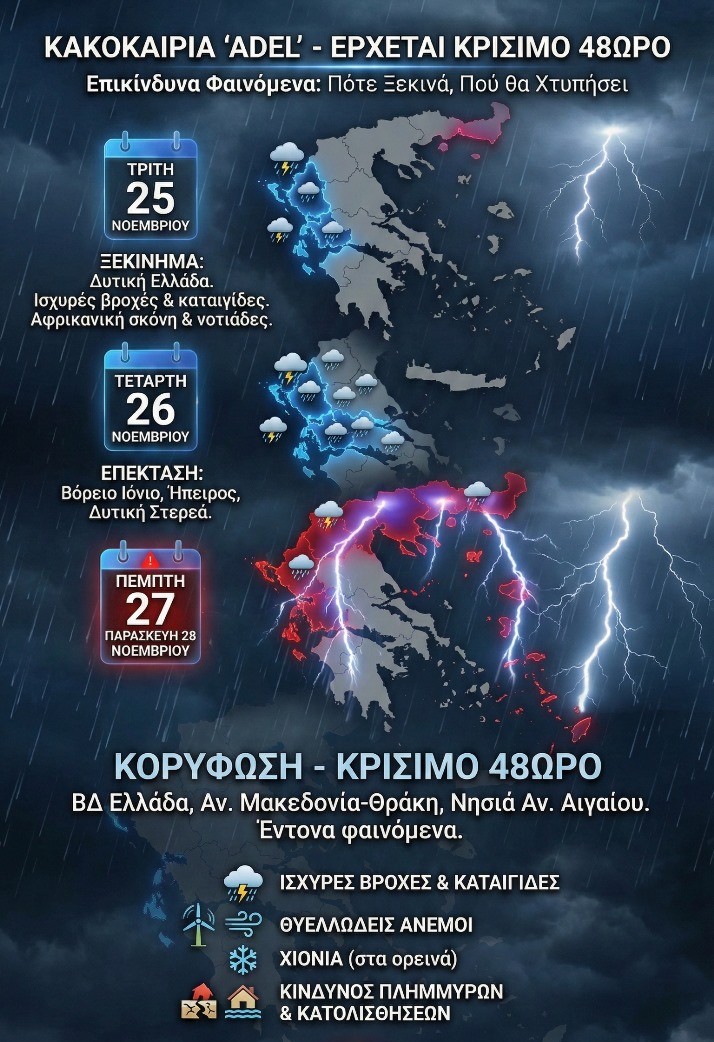 Β. Καιρικό σύστημα με το όνομα ADEL θα προκαλέσει την Πέμπτη (27-11-25) και την Παρασκευή (28-11-25) ισχυρές βροχές και καταιγίδες, που θα συνοδεύονται από τοπικές χαλαζοπτώσεις και κατά διαστήματα από πολύ ισχυρούς ανέμους, σε πολλές περιοχές της δυτικής και της βόρειας Ελλάδας καθώς και στο ανατολικό Αιγαίο.