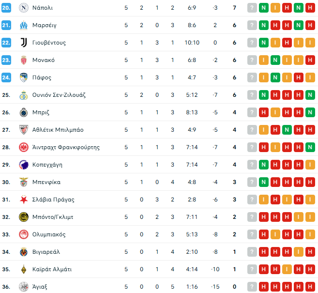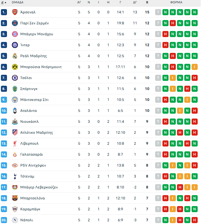 Αναλυτικά η βαθμολογία της League Phase του Champions League: