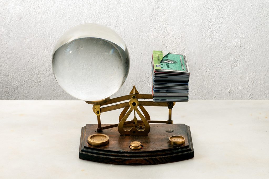 © Λυδία Δαμπασίνα, Άτιτλο, 2025, ζυγαριά, γυάλινη σφαίρα, 37 πιστωτικές κάρτες, 20,5 x 21 x 15 cm