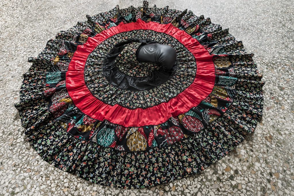 © Λυδία Δαμπασίνα, Άτιτλο, 2018, λεπτομέρεια, γάντι του μπόξ, υφασμάτινη φούστα, διάμετρος 150 εκ
