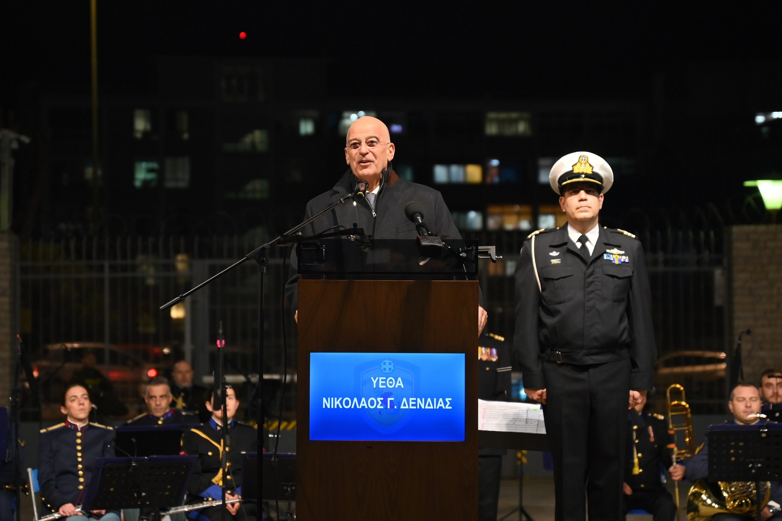«Είμαι πολύ ευτυχισμένος που βλέπω το υπουργείο απόψε, με την καινούργια του μορφή και το μνημείο μπροστά μας» υπογράμμισε ο κ. Δένδιας.