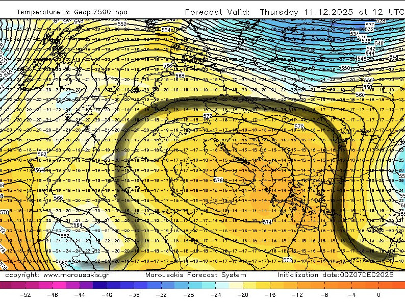 «Οπότε ένα αρκετά πιθανό σενάριο είναι να οδηγηθούμε σε βροχές και χιόνια στα βουνά μας, καιρός που συμβαδίζει με το ημερολόγιο. Ακολουθεί χάρτης από το προγνωστικό μας σύστημα στον οποίο απεικονίζεται ο τύπος εμποδισμού ατμοσφαιρικής κυκλοφορίας που περιγράψαμε παραπάνω».