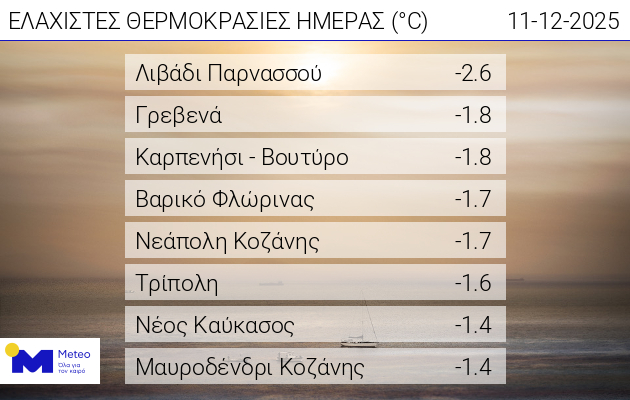 Αρνητικές τιμές θερμοκρασίας καταγράφηκαν σε ορεινούς οικισμούς το πρωί της Πέμπτης 11/12. Σύμφωνα με το δίκτυο αυτόματων μετεωρολογικών σταθμών του meteo.gr / Εθνικού Αστεροσκοπείου Αθηνών η θερμοκρασία έπεσε στους -2.6 °C στο Λιβάδι Παρνασσού. Στον σχετικό πίνακα παρουσιάζονται οι 8 σταθμοί με τις χαμηλότερες ελάχιστες θερμοκρασίες της Πέμπτης 11/12.