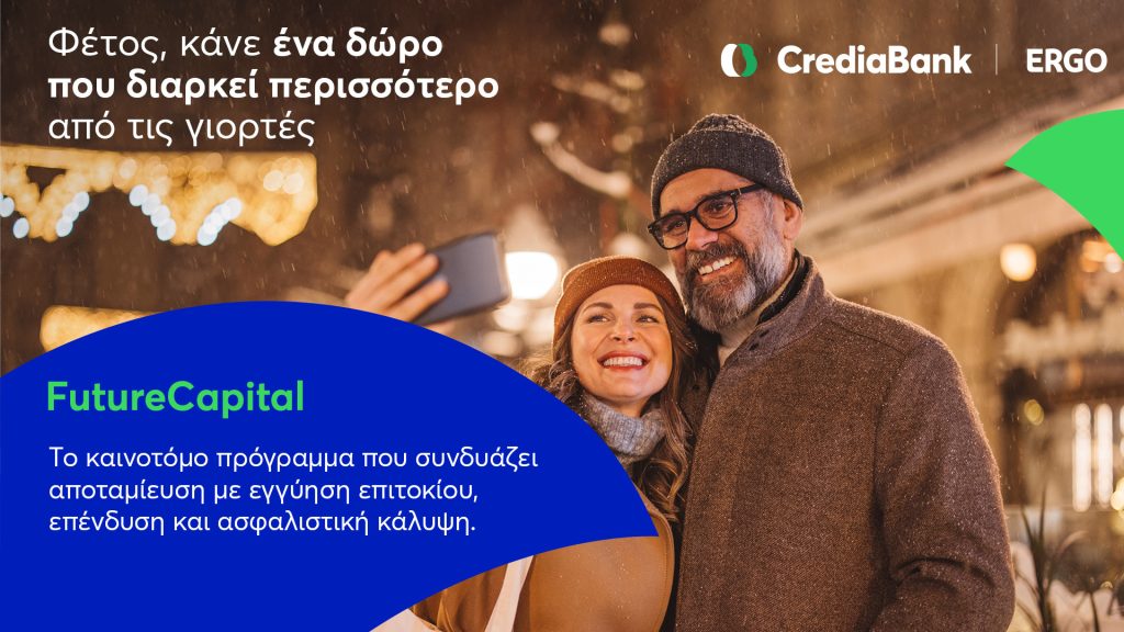 Αναρωτιέσαι αν θα μπορούσες να επενδύεις κάθε μήνα, να αποταμιεύεις με τον ρυθμό σου, να διαχειρίζεσαι τα χρήματά σου με τον δικό σου τρόπο. Σε αυτήν την ανάγκη έρχεται να απαντήσει το ευέλικτο πρόγραμμα δημιουργίας κεφαλαίου FutureCapital, από την CrediaBank σε συνεργασία με την ERGO Ασφαλιστική. Το πρόγραμμα, που συνδυάζει αποταμίευση και επένδυση, σου δίνει τη δυνατότητα να χτίζεις το κεφάλαιό σου σταδιακά για σένα ή την οικογένειά σου, προσφέροντας: