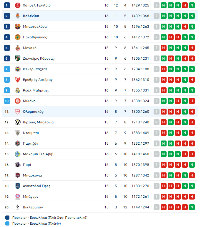 Έτσι, ο Ολυμπιακός υποχώρησε στο 8-7 (5-3 εντός έδρας και 3-4 εκτός), ενώ η Βαλένθια ανέβηκε στο 11-5 (7-1 εντός και 4-4 εκτός έδρας), έχοντας ήδη επικρατήσει και του Παναθηναϊκού στο Telekom Center Athens.