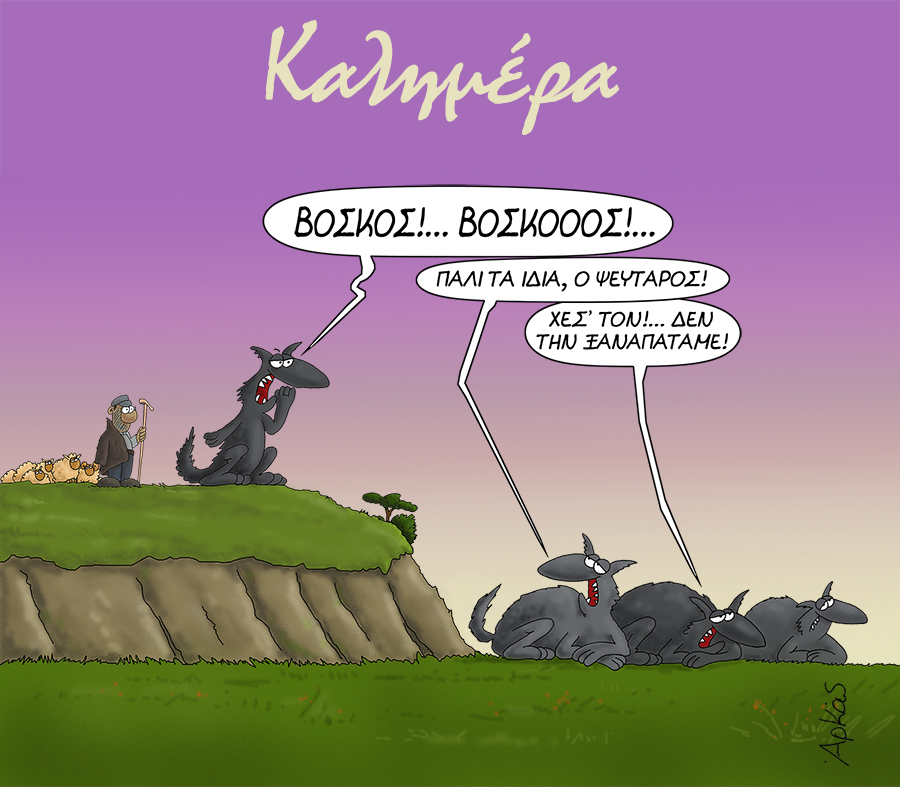 Με το γνώριμο, καυστικό του χιούμορ, ο Αρκάς επιστρέφει σε έναν διαχρονικό μύθο και τον ανατρέπει. Στη συγκεκριμένη γελοιογραφία, οι ρόλοι αντιστρέφονται: Αυτή τη φορά δεν είναι ο βοσκός που φωνάζει ψέματα, αλλά οι λύκοι που κραυγάζουν «Βοσκός!», προσπαθώντας μάταια να πείσουν. Το αποτέλεσμα; Κανείς δεν τους πιστεύει πια.