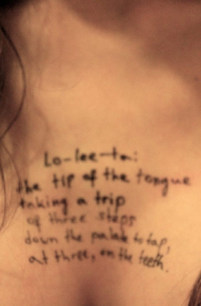 Μεταξύ των φωτογραφιών υπάρχουν επίσης εικόνες με χειρόγραφες φράσεις επάνω σε ανθρώπινο σώμα, οι οποίες παραπέμπουν στο μυθιστόρημα «Λολίτα» του Βλαντίμιρ Ναμπόκοφ. Δεν παρέχεται περαιτέρω πλαίσιο για τις συγκεκριμένες εικόνες.