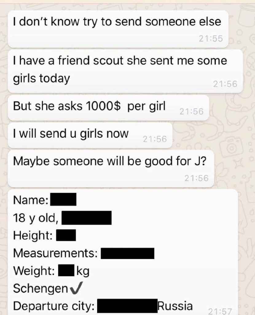 Στο μήνυμα αναφέρεται: «Δεν ξέρω, δοκίμασε να στείλεις κάποιον άλλον. Έχω μια φίλη ανιχνεύτρια, μου έστειλε μερικά κορίτσια σήμερα. Αλλά ζητά 1.000 δολάρια ανά κορίτσι. Θα σου στείλω κορίτσια τώρα. Ίσως κάποιο να είναι καλό για τον J;». Στη συνέχεια ακολουθεί λεπτομερής περιγραφή, που περιλαμβάνει όνομα, ηλικία «18 ετών», ύψος, διαστάσεις, βάρος, αναφορά στη Ζώνη Σένγκεν, καθώς και η «πόλη αναχώρησης» που έχει σβηστεί, αλλά φαίνεται ότι ταξιδεύει από την Ρωσία.