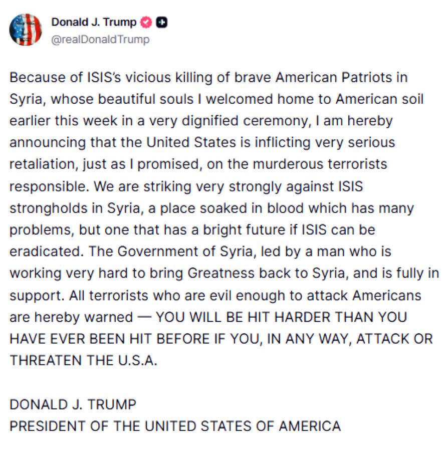 Ο αμερικανός πρόεδρος Ντόναλντ Τραμπ επιβεβαίωσε νωρίτερα μέσω Truth Social ότι βρίσκονται σε εξέλιξη «πολύ βαριά αντίποινα», αναφερόμενος σε στρατιωτικές επιχειρήσεις στη Συρία εναντίον της τζιχαντιστικής οργάνωσης Ισλαμικό Κράτος (ΙΚ), έπειτα από την επίθεση πριν από σχεδόν μια εβδομάδα η οποία στοίχισε τη ζωή σε δυο μέλη των ενόπλων δυνάμεων των ΗΠΑ και διερμηνέα.