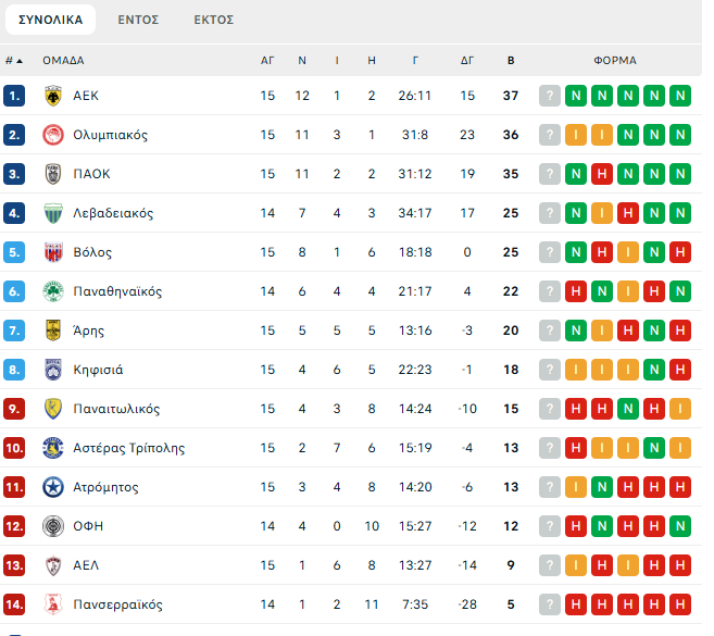 Η 15η αγωνιστική αφήνει έτσι ένα ενδιαφέρον σκηνικό στην κορυφή, με την ΑΕΚ να επωφελείται από την ισοπαλία του Ολυμπιακού και τον ΠΑΟΚ να παραμένει κοντά στη μάχη για την πρωτιά.