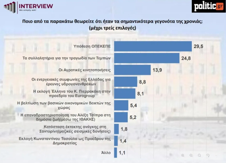 Η υπόθεση του ΟΠΕΚΕΠΕ και οι κινητοποιήσεις για την τραγωδία των Τεμπών αποτελούν τα σημαντικότερα γεγονότα της χρονιάς, συγκεντρώνοντας συνολικά πάνω από το 50% των απαντήσεων. Συγκεκριμένα, η υπόθεση ΟΠΕΚΕΠΕ βρίσκεται στην κορυφή με 29,5%, ενώ τα συλλαλητήρια για τα Τέμπη ακολουθούν με 24,8%.