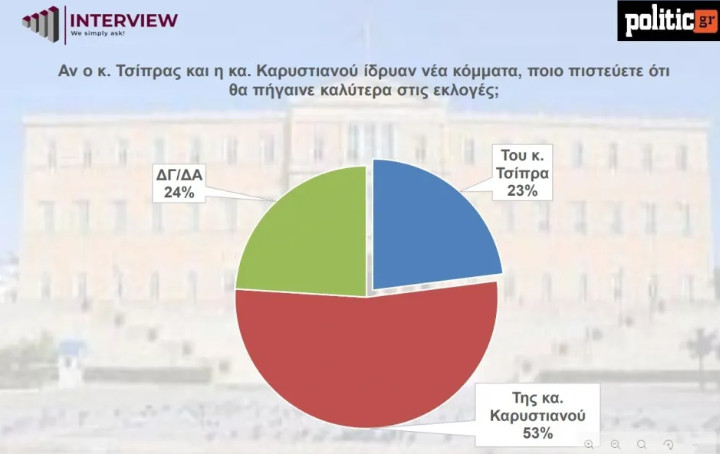 Στο πεδίο των υπό ίδρυση κομμάτων, η Μαρία Καρυστιανού εμφανίζεται με καθαρό προβάδισμα, συγκεντρώνοντας 53%. Το ποσοστό αυτό είναι υπερδιπλάσιο από το 23% που καταγράφεται για το υπό ίδρυση κόμμα του Αλέξη Τσίπρα.