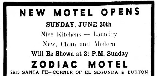 Το Zodiac Motel άνοιξε τον Ιούνιο του 1946 στο Λίνγουντ, σύμφωνα με διαφήμιση της εποχής. Σε καταχώριση δημοπρασίας του 1951 για την ίδια ιδιοκτησία 22 οικοπέδων γίνεται λόγος για «σύγχρονες εγκαταστάσεις», που περιλάμβαναν και μπάνιο.