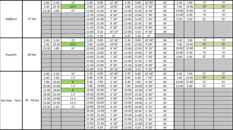 Για τις συχνότητες δρομολογίων των μέσων σταθερής τροχιάς (Γραμμές Μετρό 1, 2, 3 και Τραμ) κατά τις ημέρες των εορτών μπορείτε να ενημερωθείτε αναλυτικά από τον ακόλουθο σύνδεσμο.