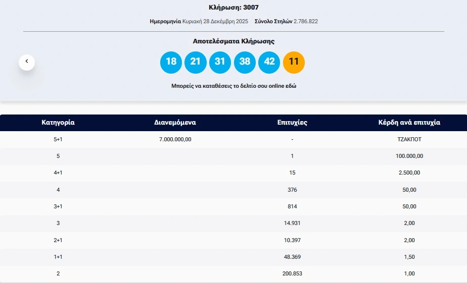 Πραγματοποιήθηκε το βράδυ τηςΚυριακής (28/12) η κλήρωση 3007 του Τζόκερ που μοιράζει στην πρώτη κατηγορία τουλάχιστον 7.000.000 ευρώ.