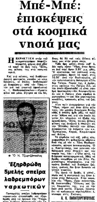 Η Μπριζίτ Μπαρντό, μία από τις μεγαλύτερες διεθνείς σταρ που σημάδεψαν τον 20ό αιώνα με την κινηματογραφική της παρουσία, την εμφάνιση και το απαράμιλλο σεξ απίλ, είχε επισκεφθεί την Ελλάδα τον Αύγουστο του 1969.