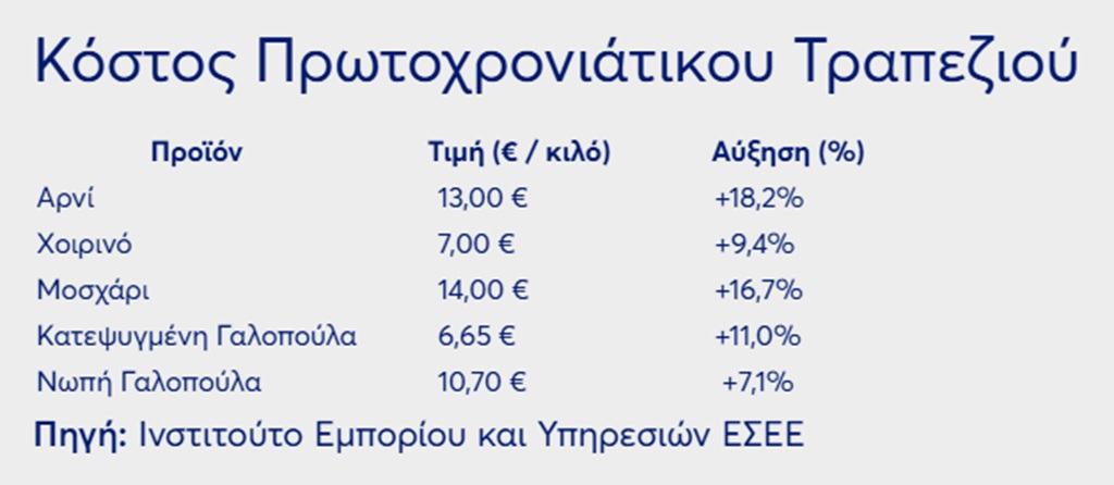Το φετινό εορταστικό τραπέζι για 6 έως 8 άτομα θα κοστίσει από 112 έως 160 ευρώ, αυξημένο από 3,6% έως 7,1% σε σύγκριση με πέρσι.