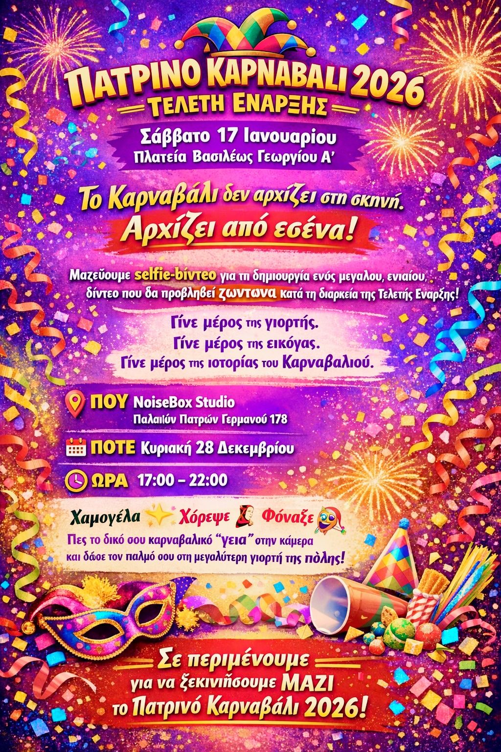 Η δράση θα πραγματοποιηθεί στο NoiseBox Studio (Παλαιών Πατρών Γερμανού 178) την Κυριακή 28 Δεκεμβρίου, από τις 17:00 έως τις 22:00. Οι συμμετέχοντες καλούνται να χαμογελάσουν, να χορέψουν και να φωνάξουν το δικό τους καρναβαλικό «γεια» στην κάμερα.