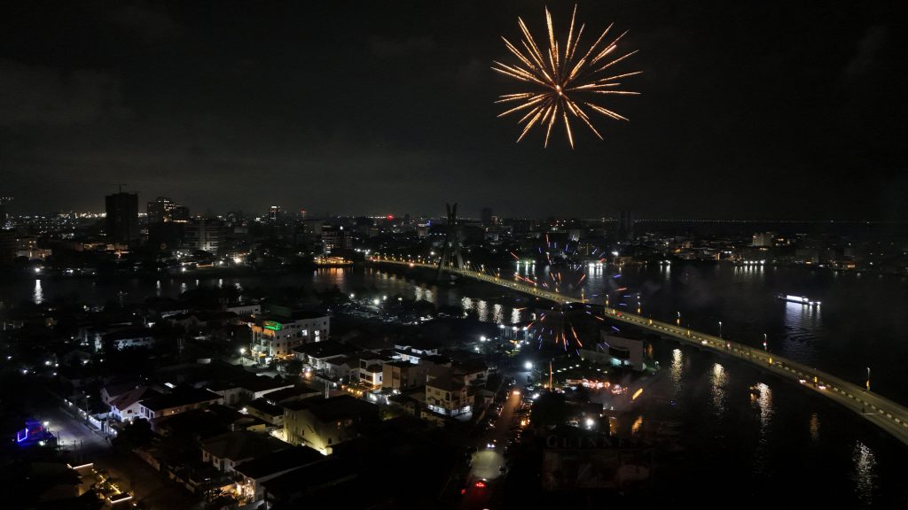 Εντυπωσιακά πυροτεχνήματα φώτισαν τον ουρανό πάνω από τη γέφυρα Lekki-Ikoyi στο Λάγος της Νιγηρίας, δημιουργώντας ένα μαγευτικό θέαμα που υποδέχθηκε το νέο έτος. Χιλιάδες κάτοικοι συγκεντρώθηκαν στην περιοχή για να παρακολουθήσουν τη φαντασμαγορική επίδειξη, η οποία αποτέλεσε το αποκορύφωμα των εορτασμών της παραμονής της Πρωτοχρονιάς.