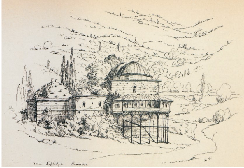 Στην Προύσα, τα νέα ιαματικά Λουτρά Γενί Καπλιτζά. (Σχέδιο στο Walker 1866)