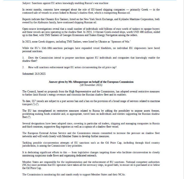 Υπενθυμίζεται ότι στις 26 Σεπτεμβρίου 2025 κατατέθηκε στο Ευρωπαϊκό Κοινοβούλιο η γραπτή ερώτηση E-003761/2025 από τον Λιθουανό ευρωβουλευτή, Petras Auštrevičius, μέλος της πολιτικής ομάδας Renew Europe, με αντικείμενο τη μεταφορά ρωσικού πετρελαίου κατά παράκαμψη των κυρώσεων της Ευρωπαϊκής Ένωσης μέσω του λεγόμενου shadow fleet.