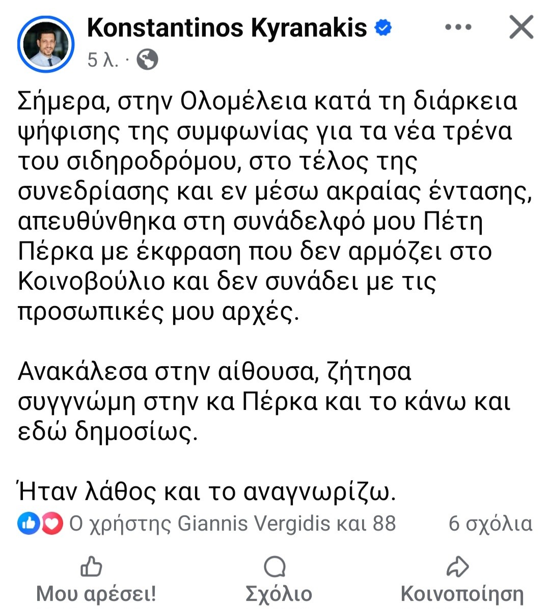 Με μία ανάρτηση του στο Χ το βράδυ της Πέμπτης, ο αναπληρωτής υπουργός Μεταφορών, Κωνσταντίνος Κυρανάκης, ζήτησε δημοσίως συγγνώμη για τη σεξιστική επίθεση κατά της βουλευτού της Νέας Αριστεράς, Πέτης Πέρκα.