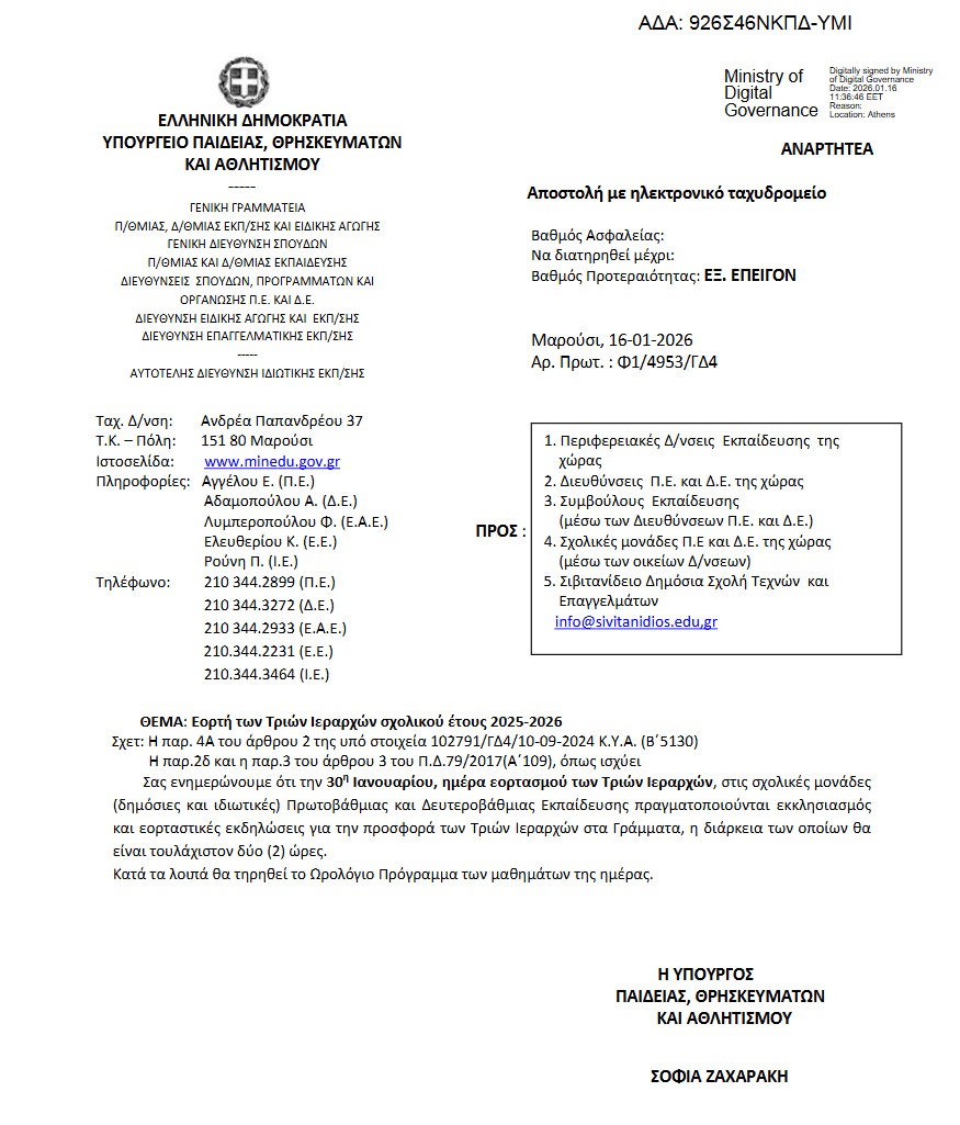 Eδώ η απόφαση της υπουργού Παιδείας και Θρησκευμάτων, Σοφία Ζαχαράκη