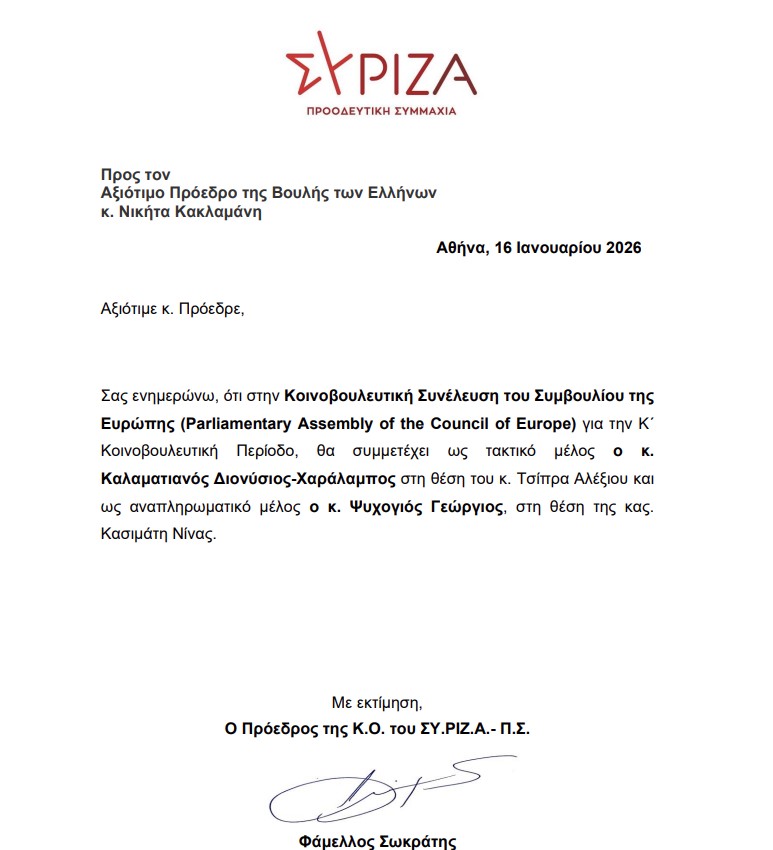 O ΣΥΡΙΖΑ αντικατέστησε την Νίνα Κασιμάτη στο Συμβούλιο της Ευρώπης. Η απόφαση έρχεται μετά την εμφάνισή της στην υποδοχή της φρεγάτας «Κίμων», παρά την κομματική γραμμή για κυβερνητική φιέστα.