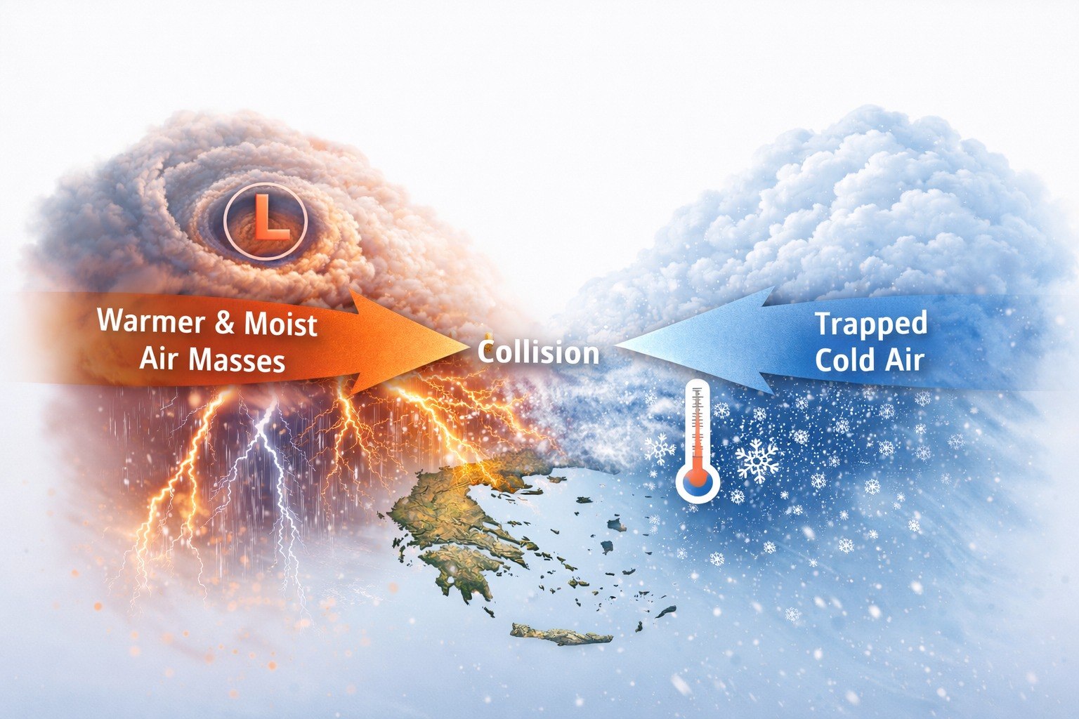- Θα υπάρχει ψυχρή, ξηρότερη αέρια μάζα κοντά στο έδαφος και στα χαμηλά στρώματα (κρύο υπόστρωμα), και από πάνω της θα αρχίσουν να εισβάλλουν θερμότερες και πολύ υγρές αέριες μάζες που συνοδεύουν το χαμηλό (υγρή τροφοδοσία).