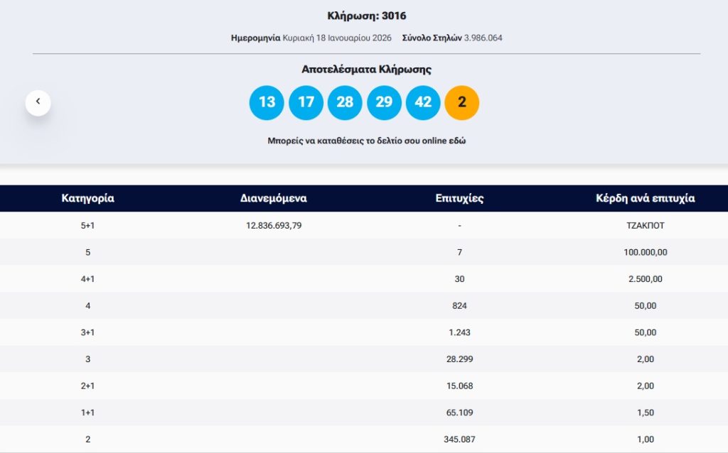 Οι τυχεροί αριθμοί της κλήρωσης είναι οι εξής: 13, 17, 28, 29 και 42. Τζόκερ το 2.