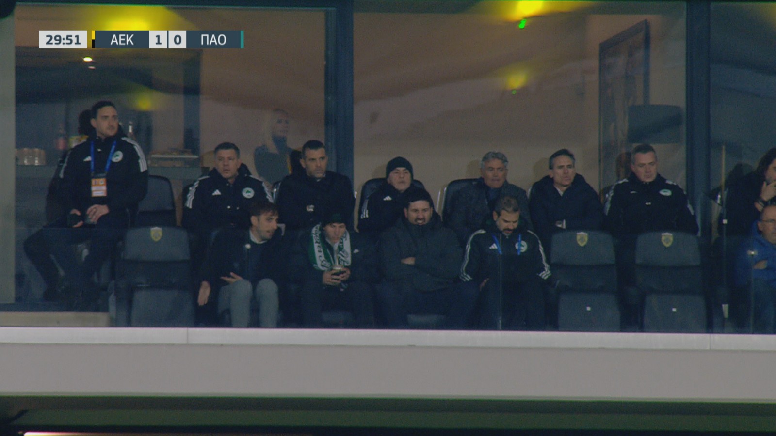 Ο Αργεντινός εξτρέμ δεν έχασε την ευκαιρία να δει για πρώτη φορά την νέα του ομάδα, με την κάμερα να βρίσκει στην σουίτα των επισήμων δίπλα στον Γιάννη Αλαφούζο.
