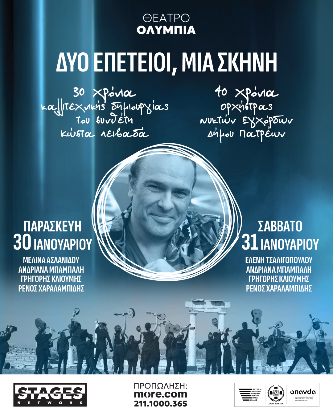 Το Ολύμπια και η Stages Network παρουσιάζουν τη συναυλία «Δύο Επέτειοι, Μία Σκηνή», με αφορμή τη συμπλήρωση τριάντα δημιουργικών χρόνων του συνθέτη Κώστα Λειβαδά στην ελληνική μουσική σκηνή και σαράντα χρόνων συνεχούς παρουσίας και δημιουργικής προσφοράς της Ορχήστρας Νυκτών Εγχόρδων «Θανάσης Τσιπινάκης» του Δήμου Πατρέων.