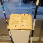 Στον απέναντι τοίχο κυριαρχούν τα έντονα χρώματα και τα γεωμετρικά σχήματα πάνω στον καμβά, διότι τον απασχολεί η σχέση με το κενό ως άλλη μορφή ενέργειας. Κι όσο για εκείνο το ανοιχτό βιβλίο με τις χρωματιστές κουκίδες που είναι ακουμπισμένο πάνω σε ένα βάθρο και περιστοιχισμένο από δυο κοντάρια διηγείται: «Είναι ένα βιβλίο που εντόπισα σε ένα παλαιοπωλείο του Παρισιού τη δεκαετία του 1980 και αφορά σε μνήμες πολέμου. Όταν το άνοιξα άρχισαν να πέφτουν από τις σελίδες του αποξηραμένα λουλούδια. Και έπλασα με το νου μου μια ιστορία: ότι ο ιδιοκτήτης του δεν άντεξε τη φρίκη του πολέμου και αποξήραινε λουλούδια που τα έβαζε εν συνεχεία στο βιβλίο. Στα σημεία που τα λουλούδια είχαν αφήσει ίχνη ζωγράφισα κυκλάκια για να απαλύνω αυτά τα σημάδια».