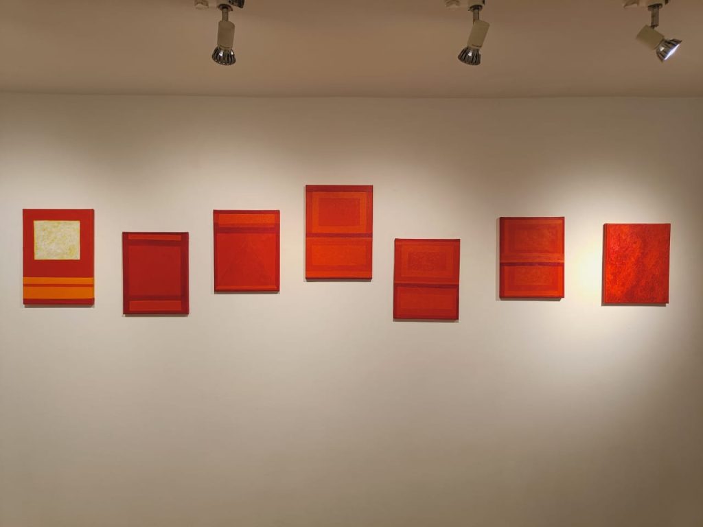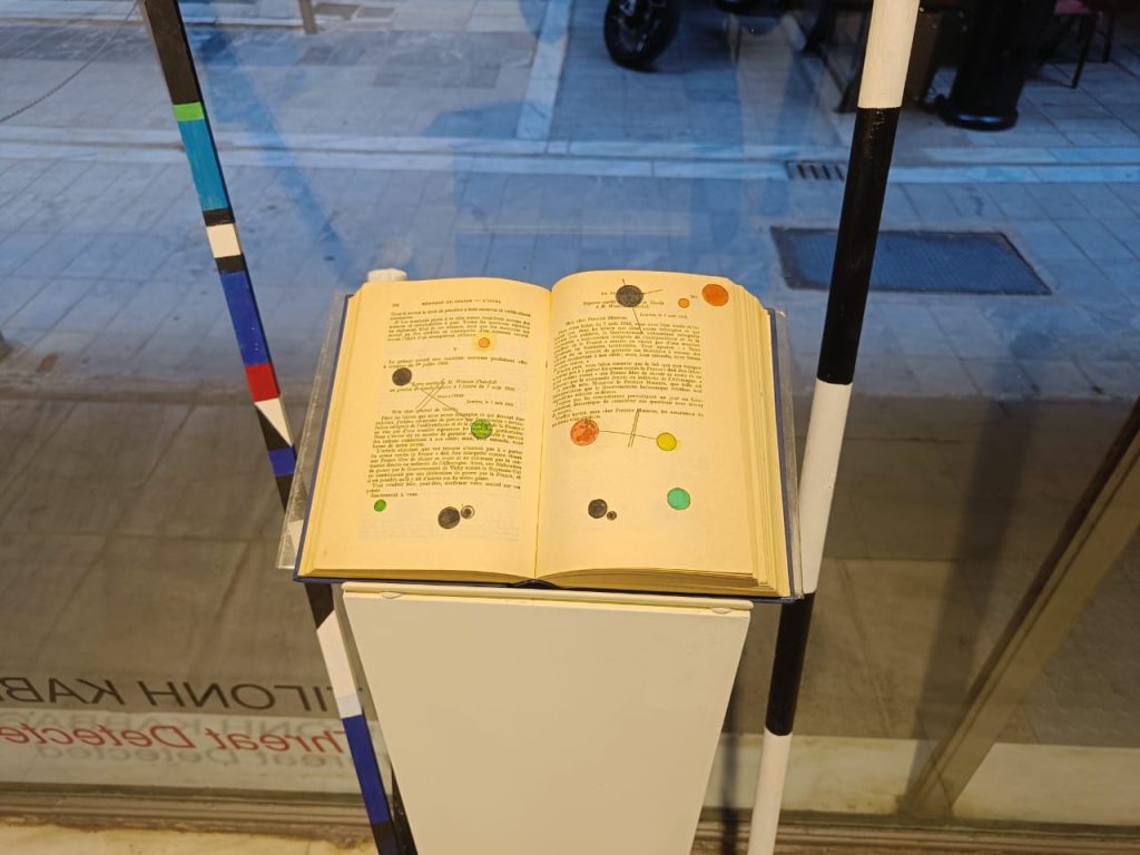 Στον απέναντι τοίχο κυριαρχούν τα έντονα χρώματα και τα γεωμετρικά σχήματα πάνω στον καμβά, διότι τον απασχολεί η σχέση με το κενό ως άλλη μορφή ενέργειας. Κι όσο για εκείνο το ανοιχτό βιβλίο με τις χρωματιστές κουκίδες που είναι ακουμπισμένο πάνω σε ένα βάθρο και περιστοιχισμένο από δυο κοντάρια διηγείται: «Είναι ένα βιβλίο που εντόπισα σε ένα παλαιοπωλείο του Παρισιού τη δεκαετία του 1980 και αφορά σε μνήμες πολέμου. Όταν το άνοιξα άρχισαν να πέφτουν από τις σελίδες του αποξηραμένα λουλούδια. Και έπλασα με το νου μου μια ιστορία: ότι ο ιδιοκτήτης του δεν άντεξε τη φρίκη του πολέμου και αποξήραινε λουλούδια που τα έβαζε εν συνεχεία στο βιβλίο. Στα σημεία που τα λουλούδια είχαν αφήσει ίχνη ζωγράφισα κυκλάκια για να απαλύνω αυτά τα σημάδια».